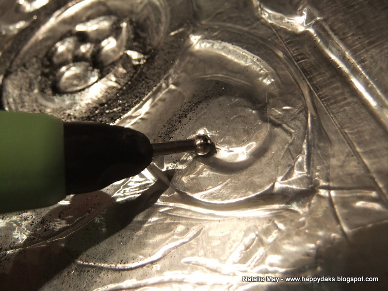 Next thing I did was create some patterns using various tools. Firstly I did some scrape with my fingernails, then some zig zags and dots with the scorer and finally using a Cuttlebug embossing folder, I transferred the pattern by using a rolling pin to force the pattern thru to the foil tape.